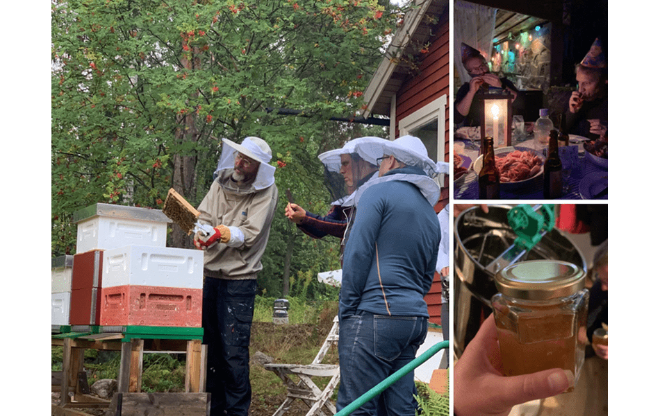 Henrik visade oss hur bi-samhällen fungererar och sen fick vi också slunga varsin burk honung att ta med hem. Framemot kvällen drog vi fram grill, kulörta lampor, kräftor, tillbehör, hattar och sånghäfte.